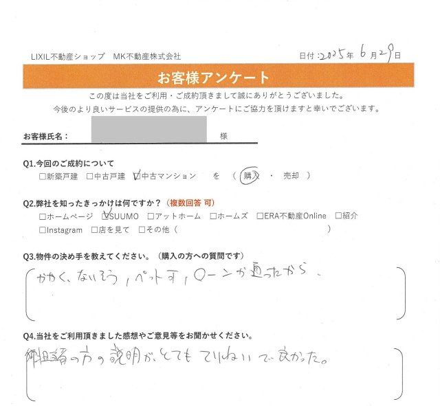Q.今回のご成約について A.中古マンションを購入 Q.弊社を知ったきっかけは何ですか? A.SUUMO Q.物件の決め手を教えてください A.価格・内装・ペット可・ローンが通ったから Q.当社をご利用頂きました感想やご意見等 A.ご担当者の方の説明がとても丁寧で良かった。